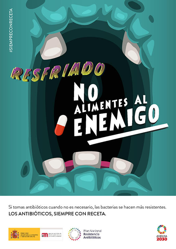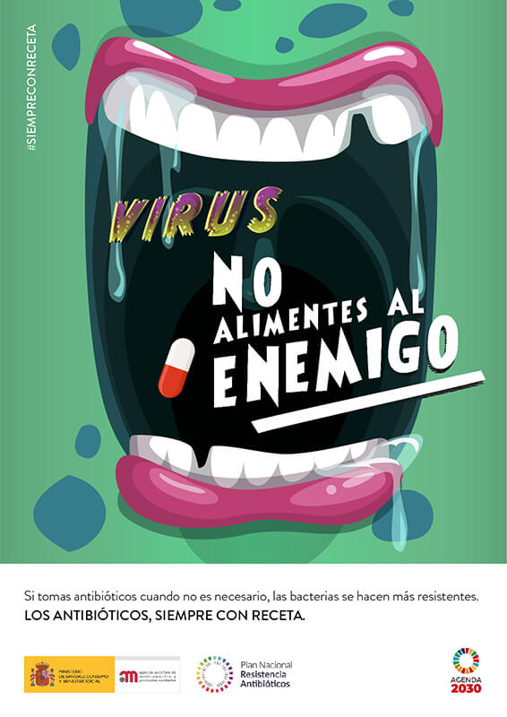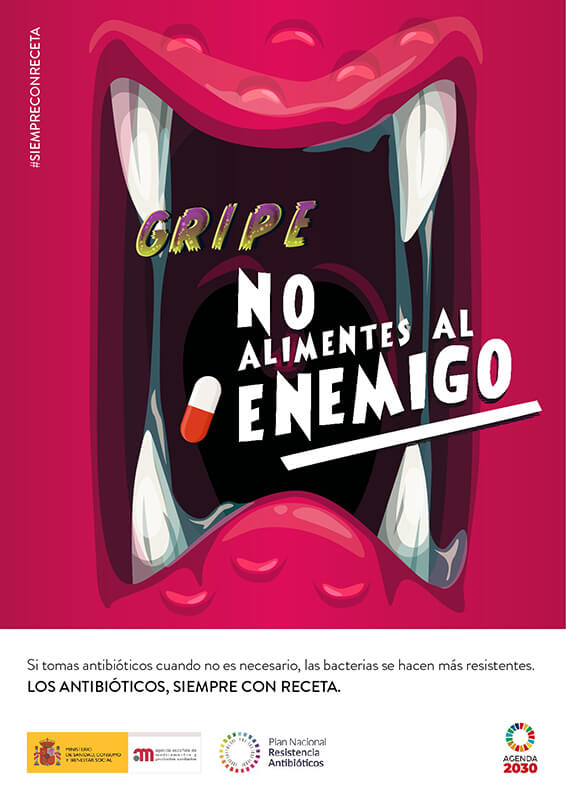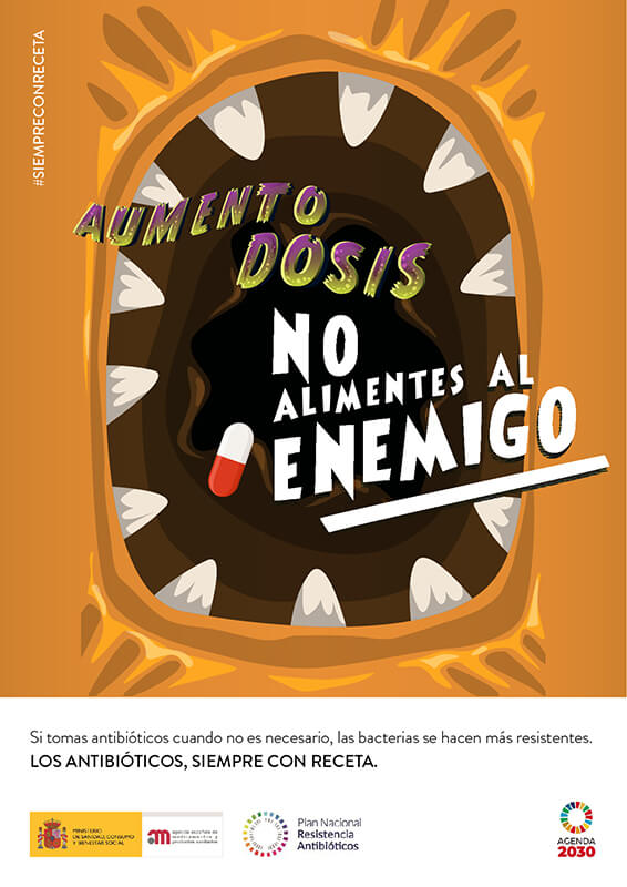 El concepto se centra en el riesgo que representa el uso irresponsable de antibiótico, utilizando como claim una expresión popular reconocible por todos los públicos: NO ALIMENTES AL ENEMIGO. El código gráfico ayuda a comunicar la idea de manera amable.
